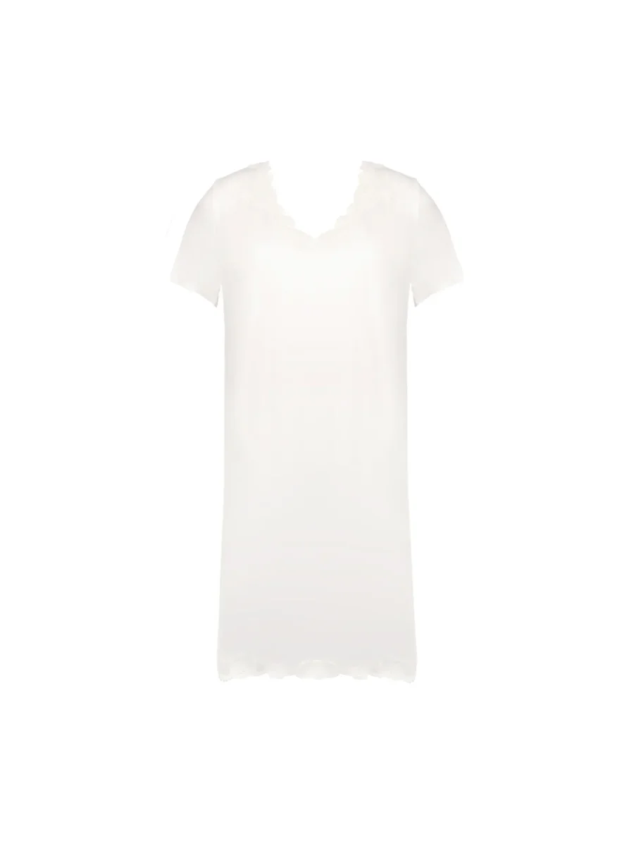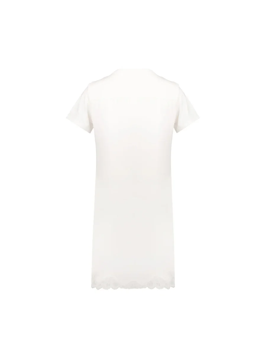 - Bordure en dentelle à l’encolure et à l’ourlet.