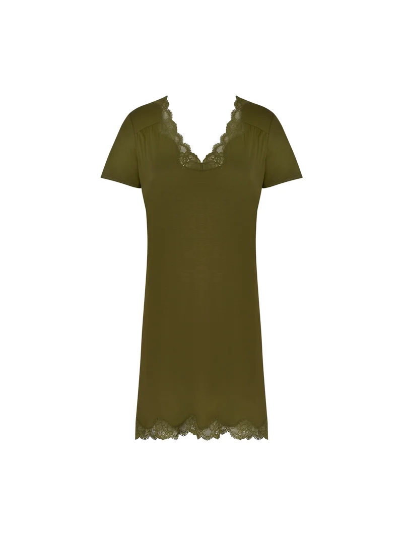 Une nuisette en mélange modal avec manches courtes et détails en dentelle, élégante et confortable.