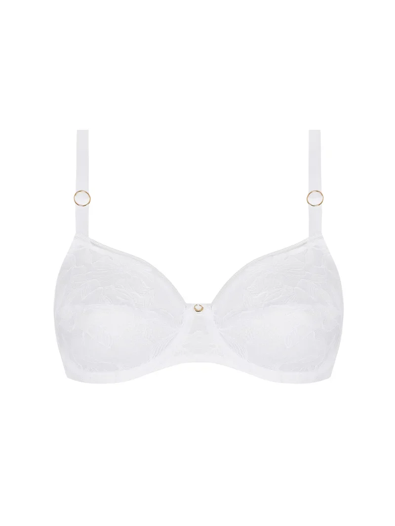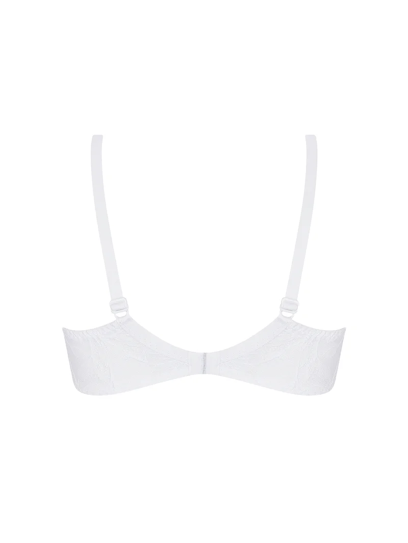 Un soutien-gorge en dentelle couvrant alliant un maintien structuré à des détails délicats en blanc lumineux.