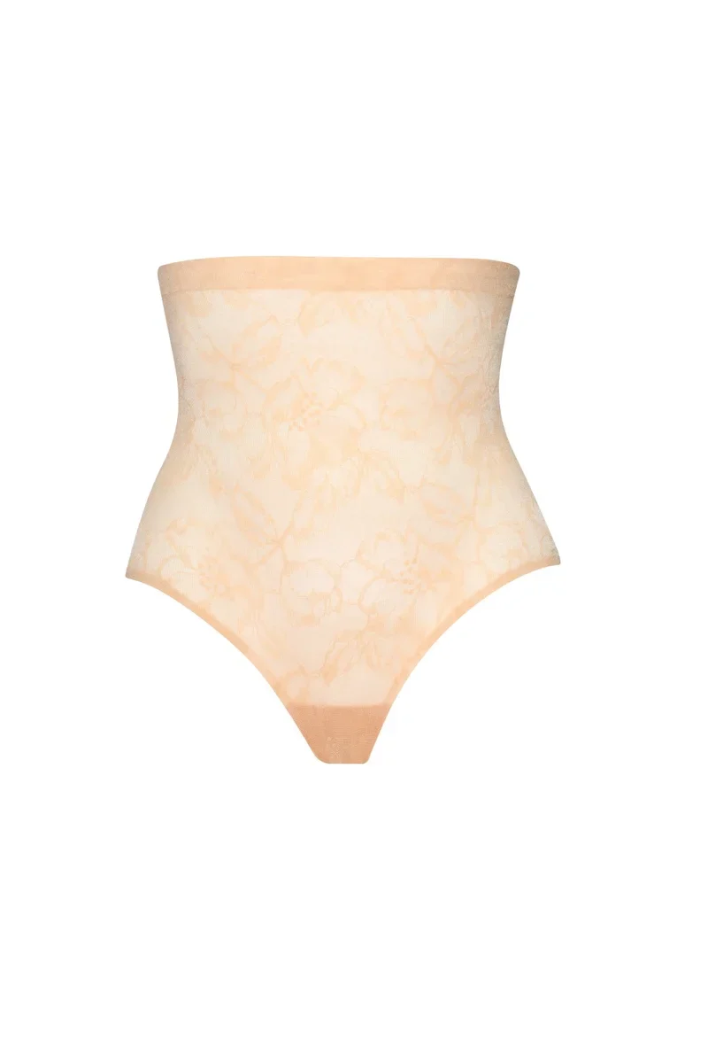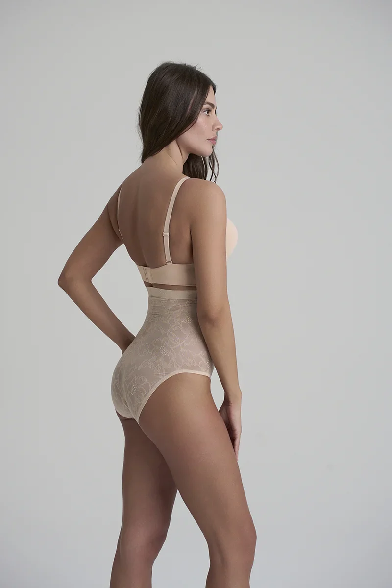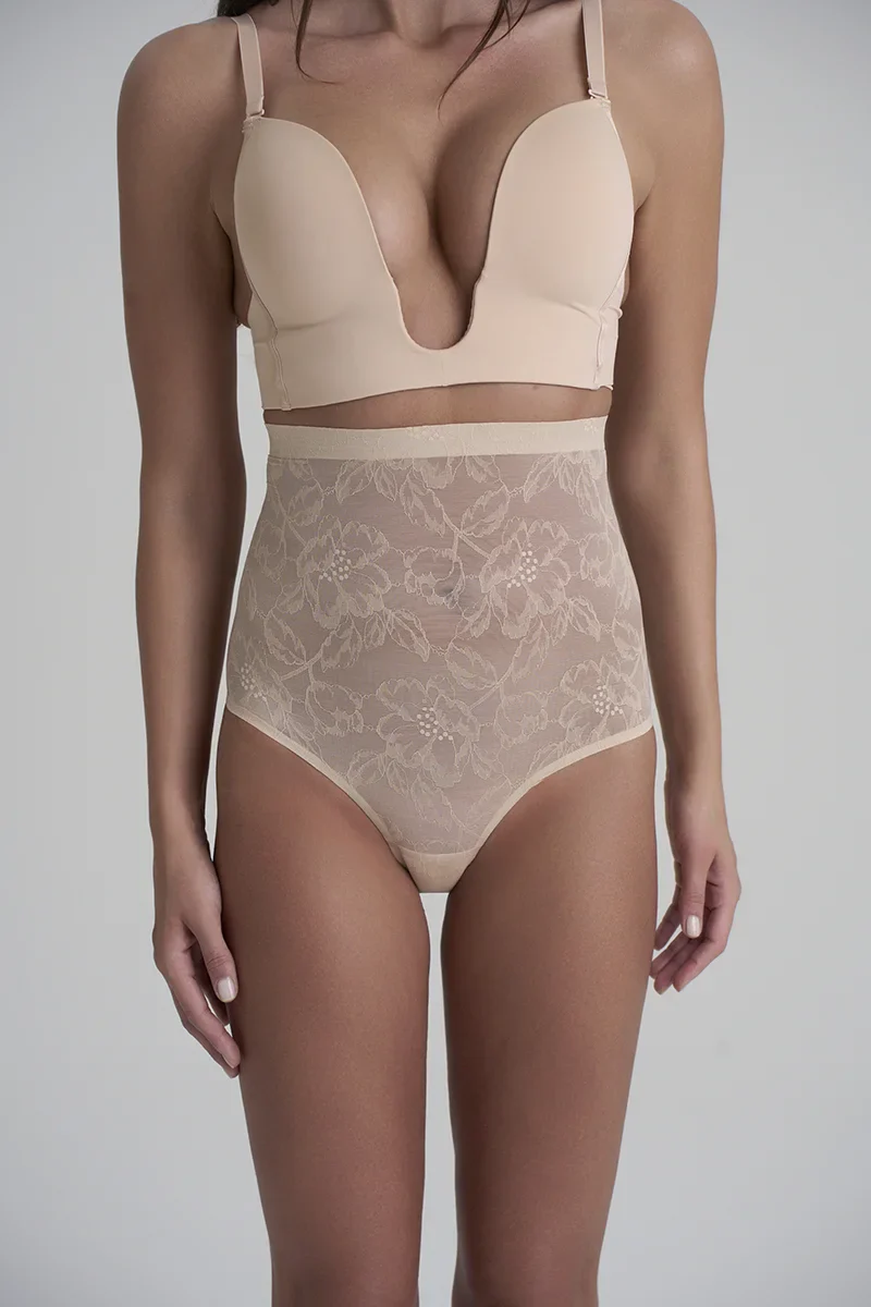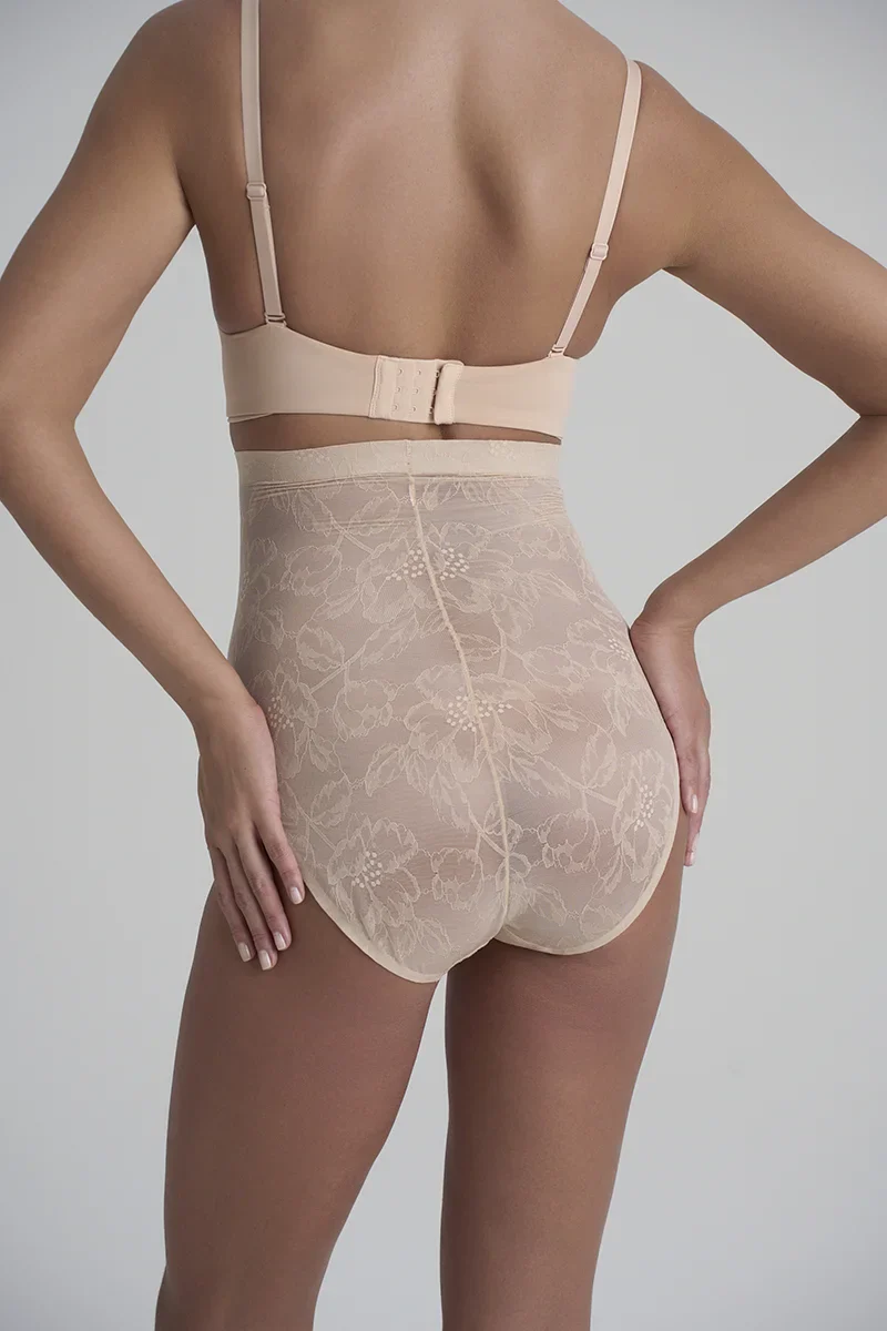 La culotte gainante taille haute en dentelle beige ByeBra associe une dentelle élégante à un léger maintien pour une silhouette raffinée au quotidien.