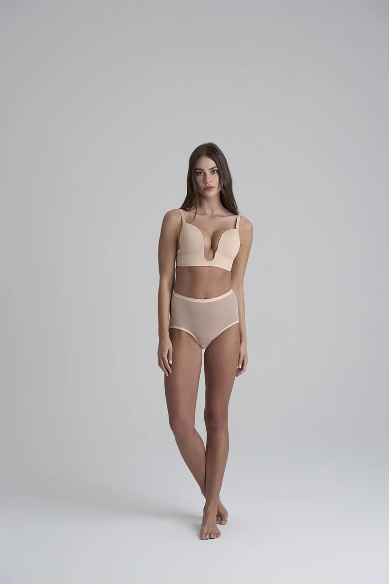 La culotte gainante taille mi-haute en tulle beige de ByeBra offre un galbe équilibré avec une finition douce, respirante et élégante.