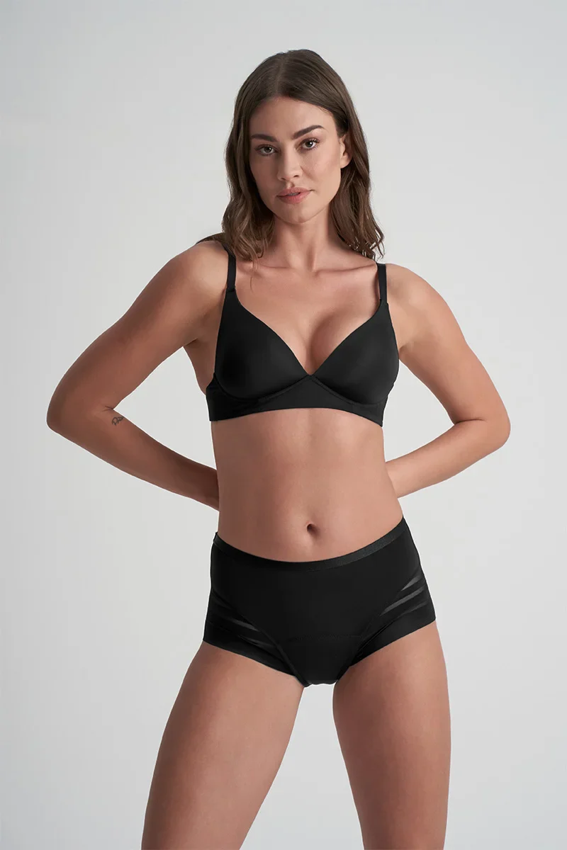 La culotte menstruelle anti-fuites ByeBra noire allie un style en dentelle élégant à une protection discrète pour flux moyen, pour un port quotidien en toute confiance.