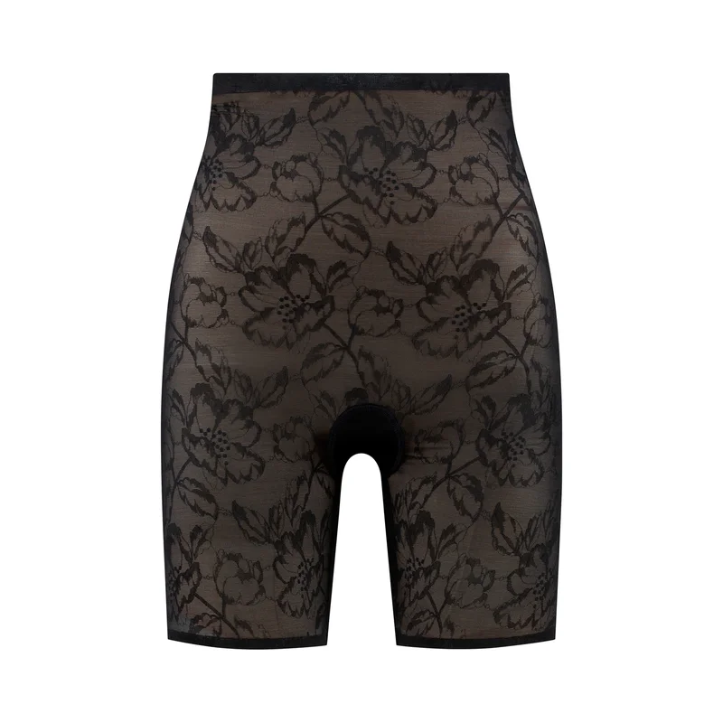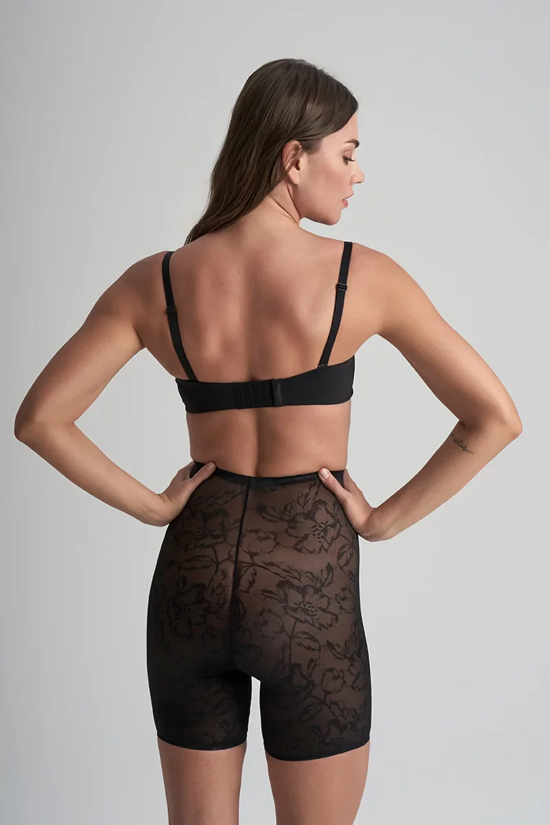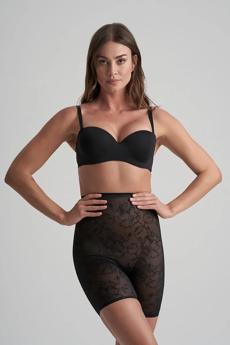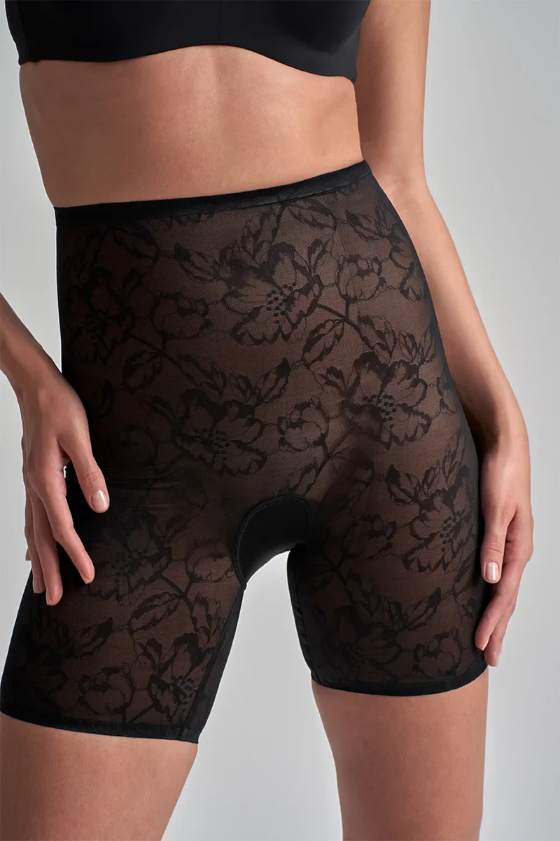 Le short gainant taille haute en dentelle ByeBra noir allie dentelle sophistiquée, galbe lissant et confort au quotidien.