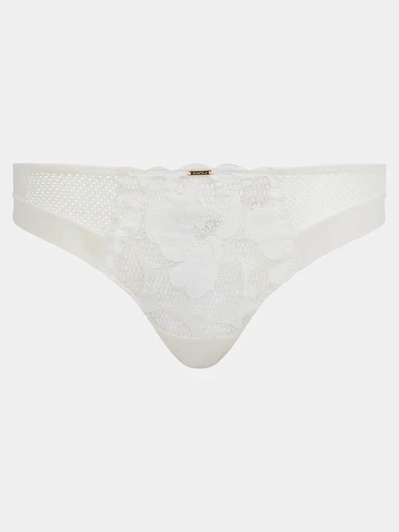 Un élégant tanga brodé offrant une couverture légère dans la teinte lait satinée lumineuse de Chantelle.