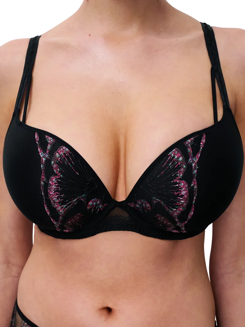 Un soutien-gorge extra push-up séduisant en noir romantique conçu pour mettre en valeur le décolleté et la confiance grâce à la coupe précise de Chantelle.
