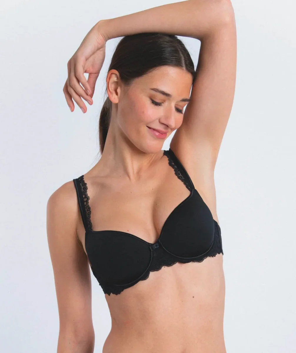 Le soutien-gorge Gaby Spacer noir allie la douceur d’un soutien-gorge t-shirt à l’élégance de la dentelle. Ses bonnets aérés épousent la poitrine sans l’alourdir, ce qui le rend idéal sous les vêtements moulants. L’armature assure un maintien structuré, tandis que les empiècements de dentelle le long de la bande apportent une touche de sophistication discrète. Parfait au quotidien, au bureau ou en voyage.
