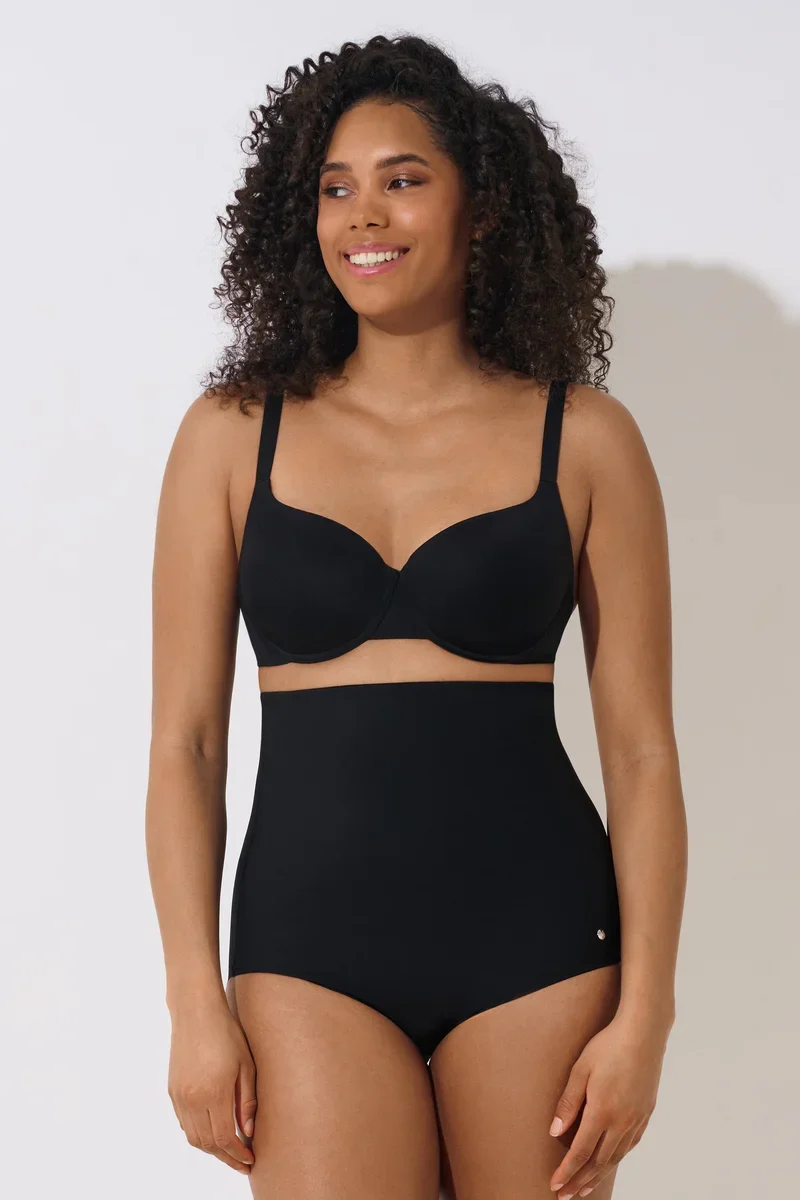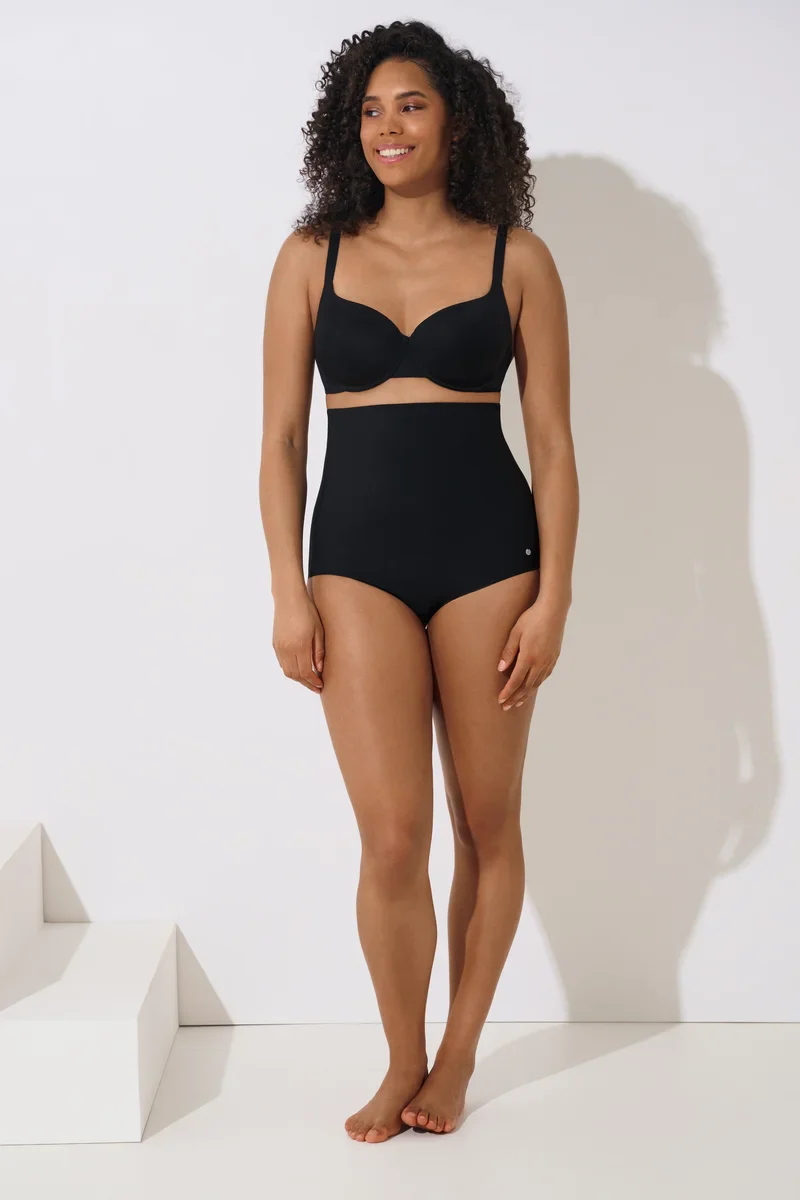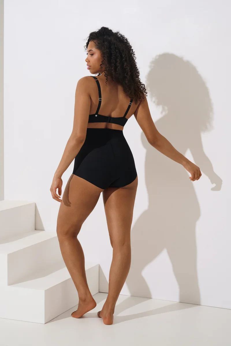 Culotte gainante taille haute noire offrant un maintien en douceur avec des lignes épurées.