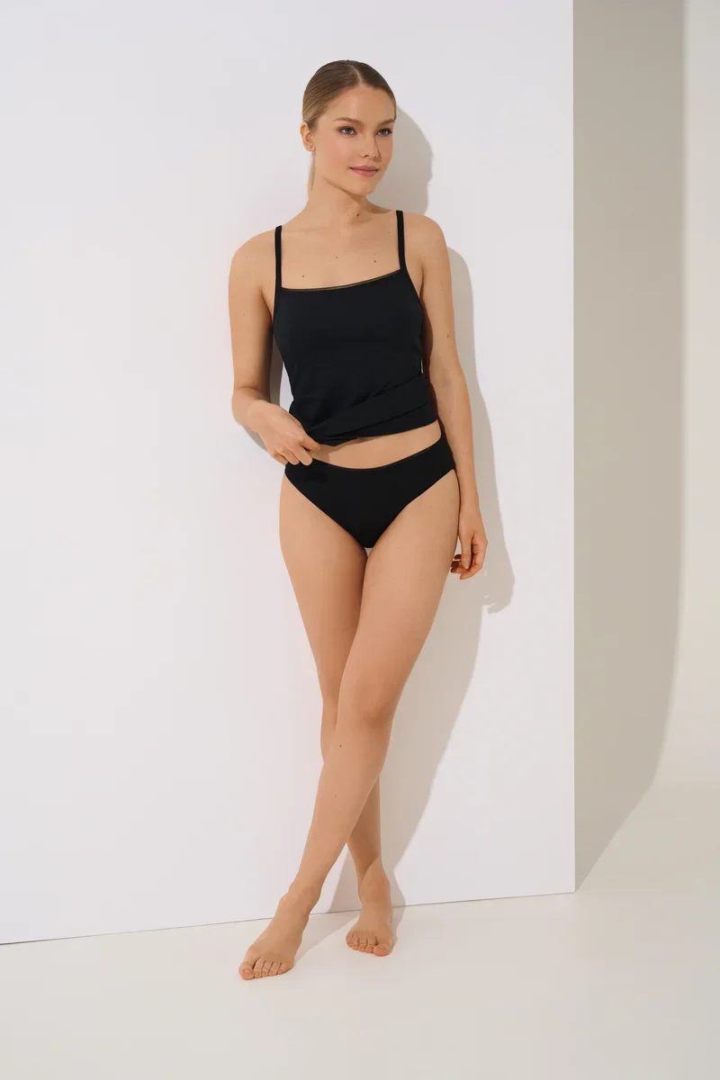 Un haut noir élégant et doux confectionné à partir d’un mélange de coton et de modal respirant, parfait à porter toute la journée.
