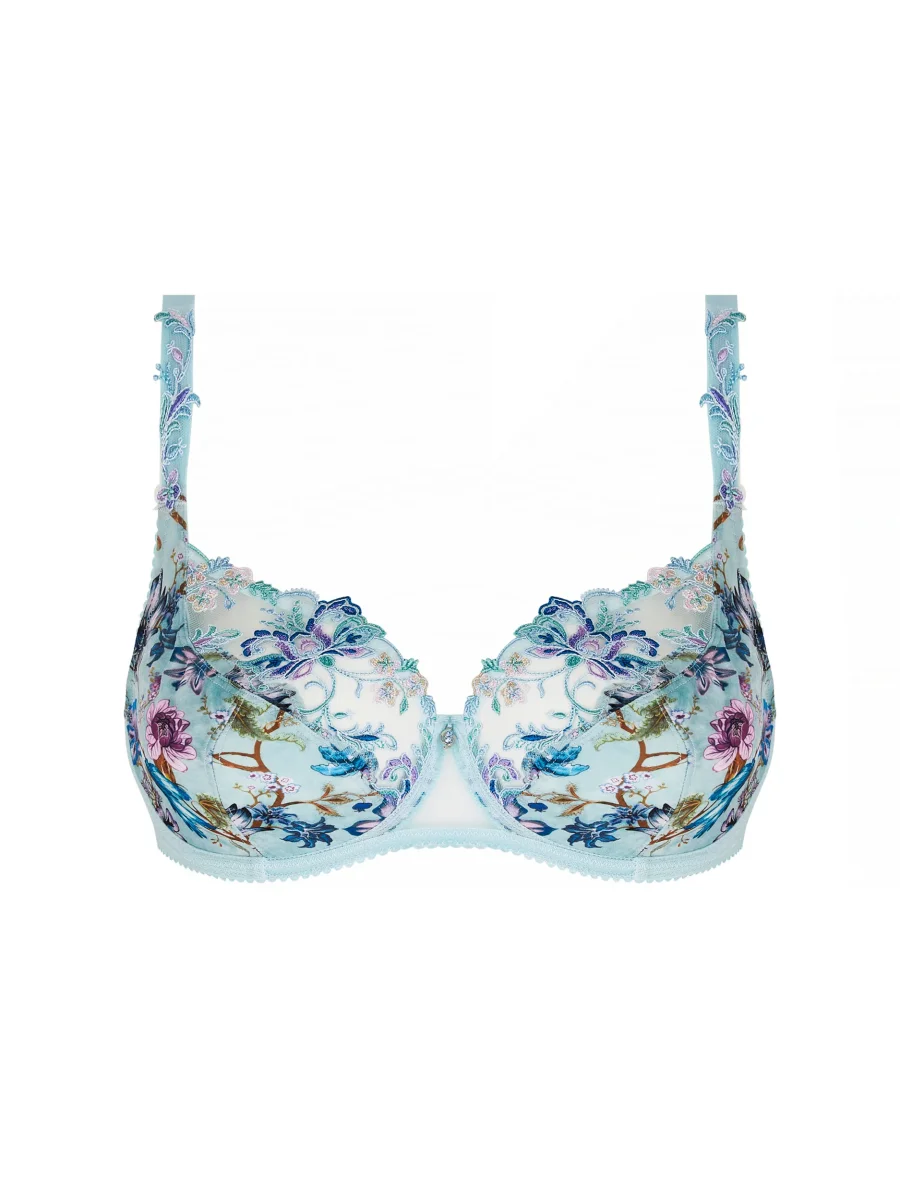 - La bande de soutien-gorge en tulle brodé multifilaments festonné est ornée d’une découpe en maille imprimée au dos.