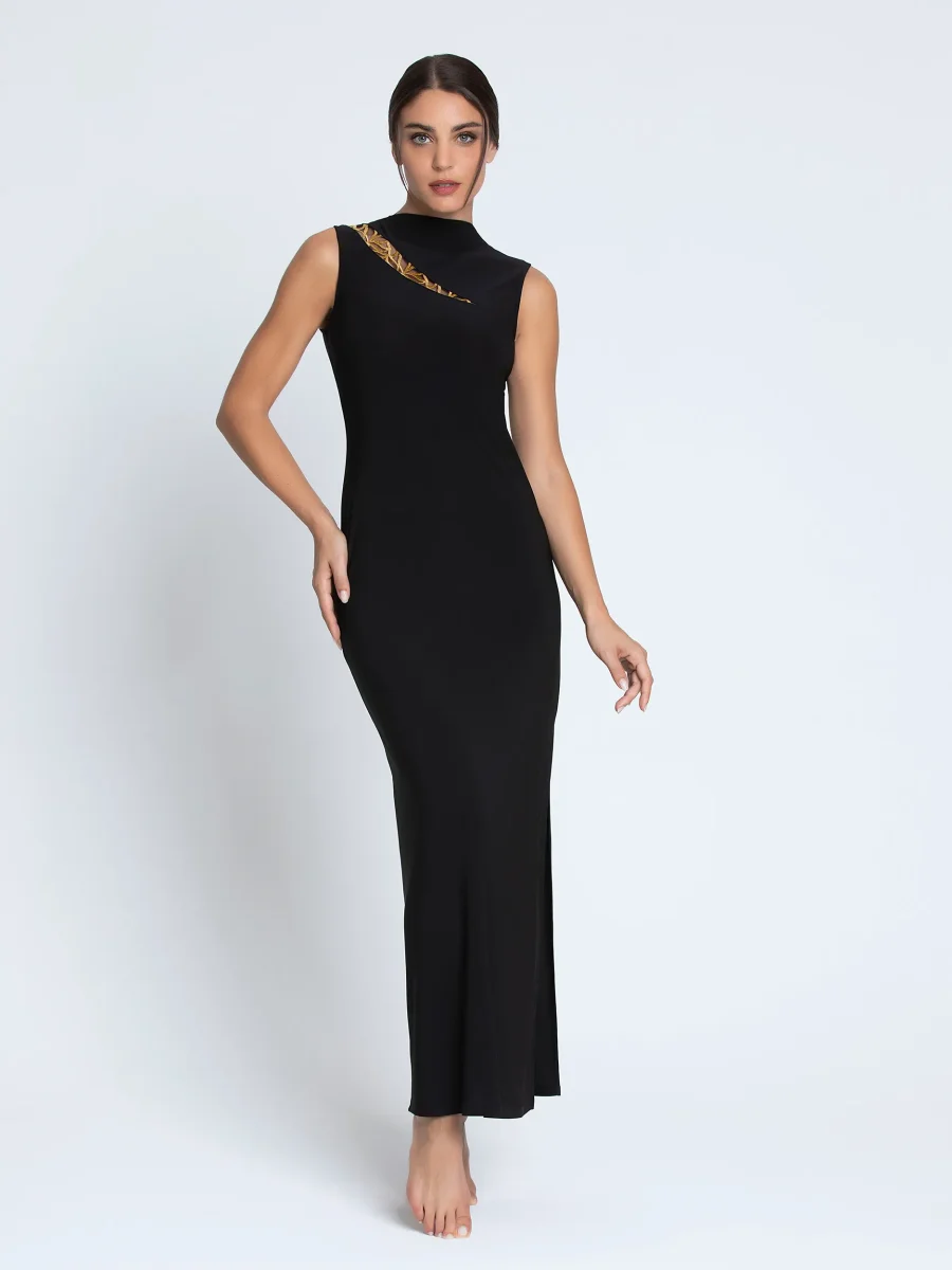 - Robe en maille unie avec incrustation de broderie laminée dorée sur le devant.