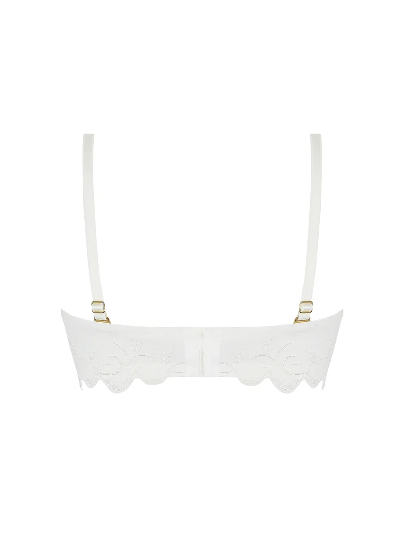 - Soutien-gorge à découpe plongeante en broderie festonnée avec broderie multifils et guipure, côté du bonnet en dentelle.