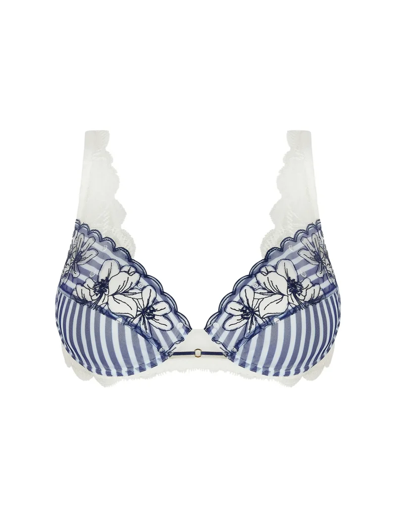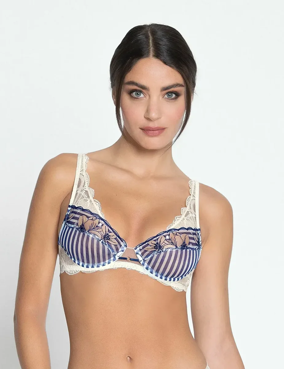 Inspiré par l’élégance de la Côte d’Azur, le Cap Au Levant La collection de Lise Charmel allie lingerie de luxe et touche nautique ludique. Composée de soutiens-gorge, de slips et de porte-jarretelles brodés dans des tons bleu marine et ivoire, cette collection se pare de motifs floraux artistiques et de rayures délicates pour un look frais et estival.