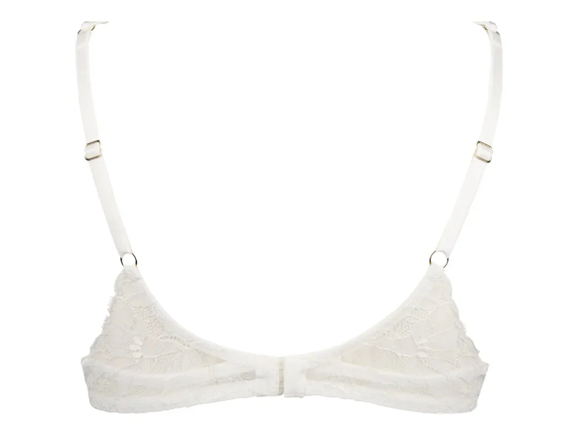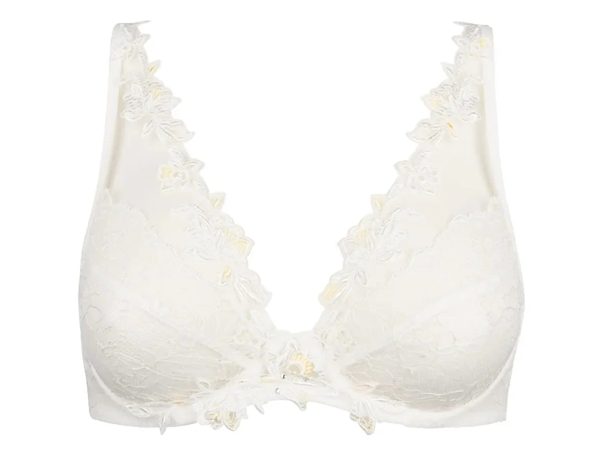 - Décolleté plongeant bordé d’ailes en dentelle brodée
