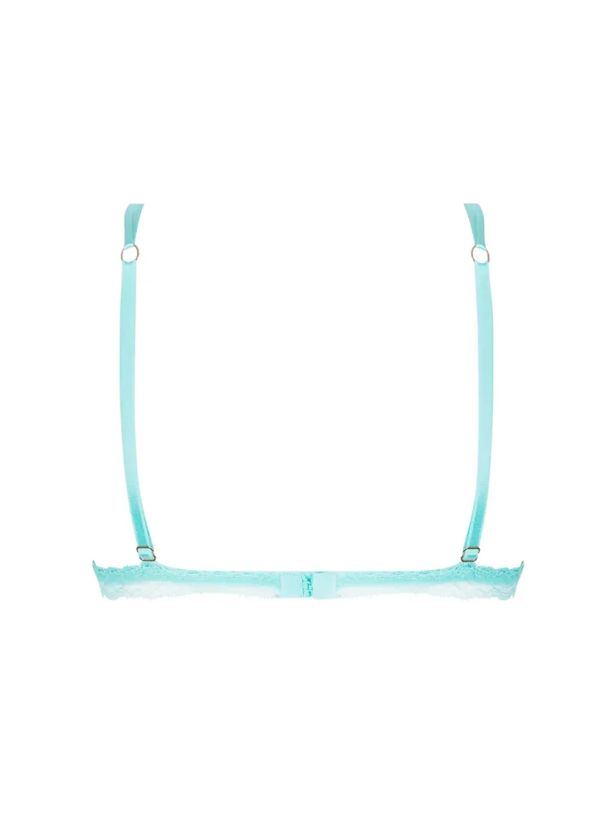 Magnifique soutien-gorge triangle avec broderies florales multifils, bonnets en guipure et côtés en laize brodés. Fini avec des strass dorés.