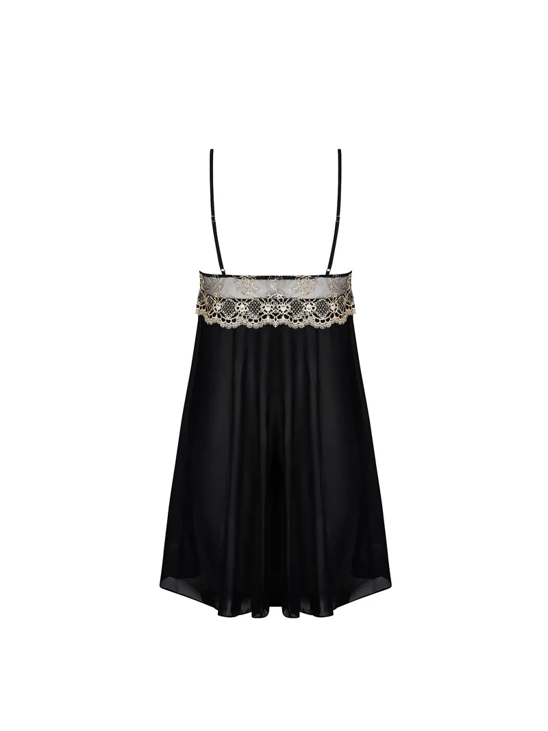 Une nuisette romantique et transparente en Noir Éclat, fluide et douce avec de la dentelle brodée pour une silhouette délicate et sensuelle.