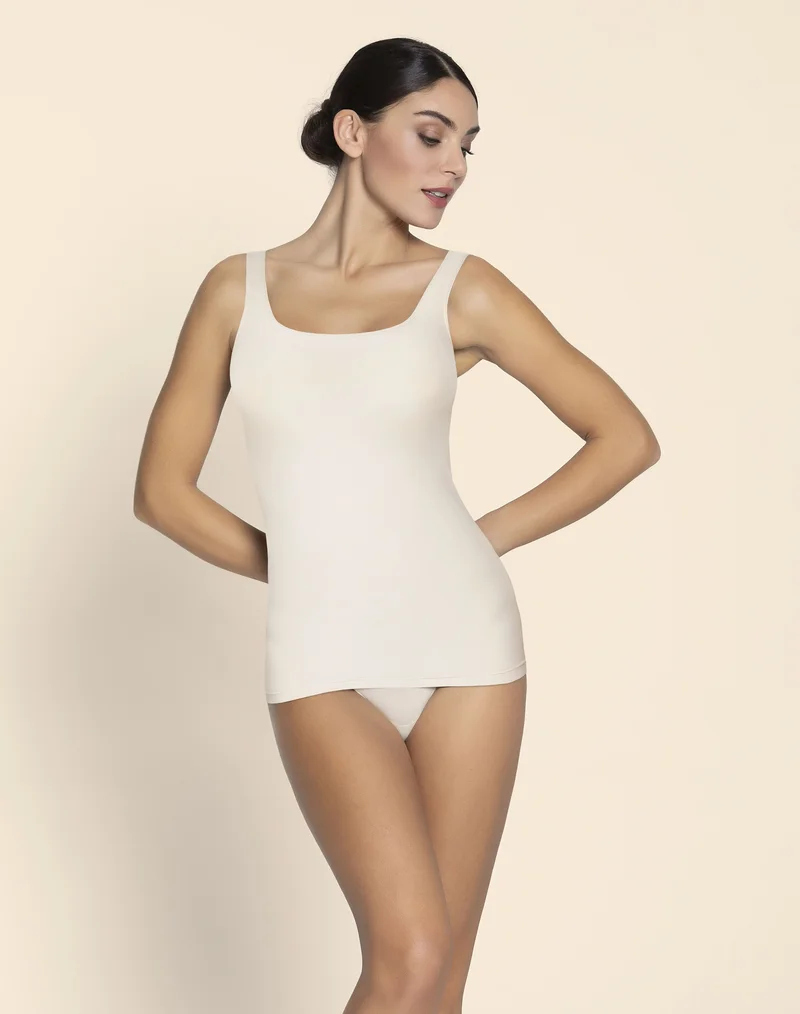 Le top Lise Charmel Sensation Plaisir en écru nacre se drape avec élégance et offre un confort tout en douceur soyeuse.