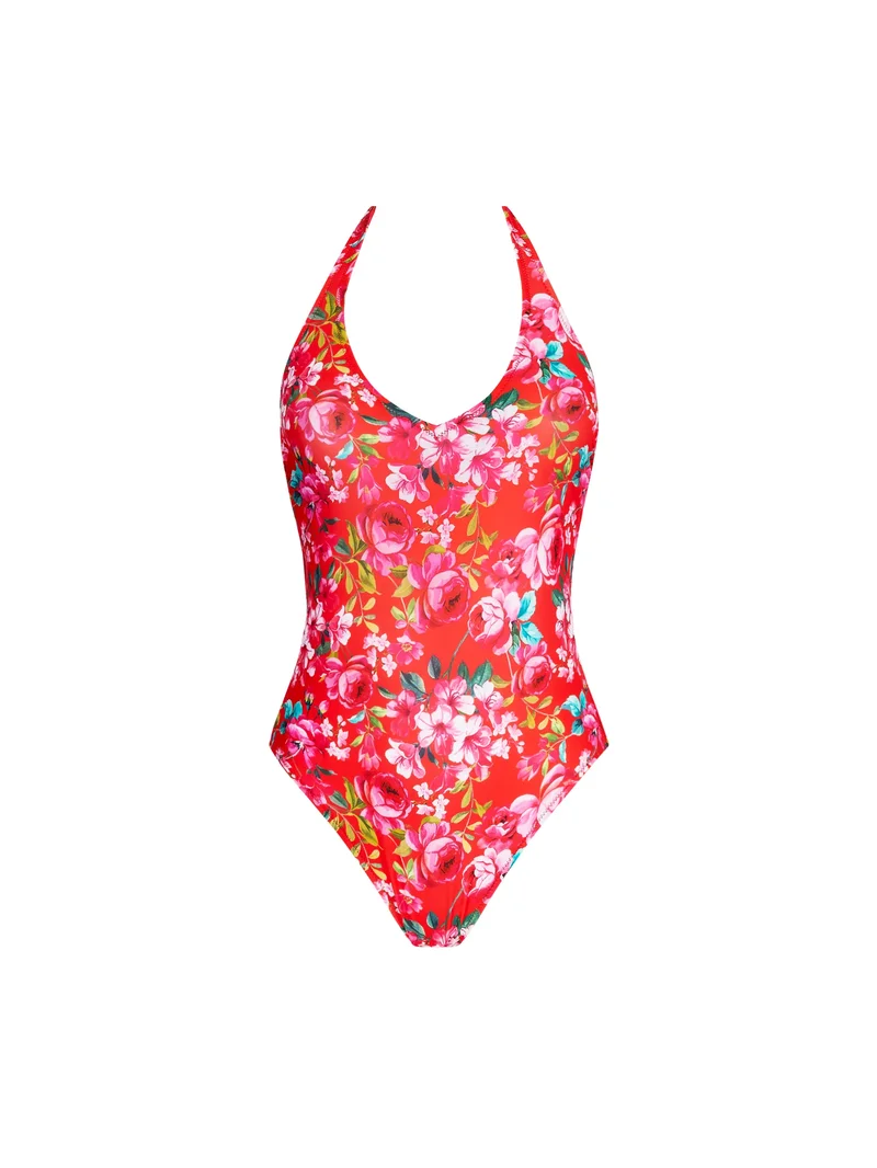 Un maillot de bain une pièce fluide avec un élégant col halter.