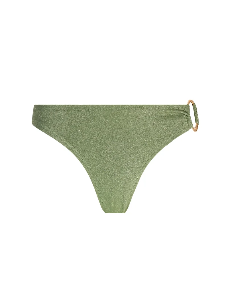 Un bas de bikini taille haute rétro-chic avec une coupe haute allongeant les jambes et un détail d’anneau luxueux.