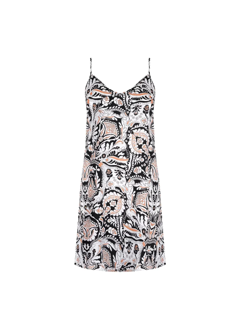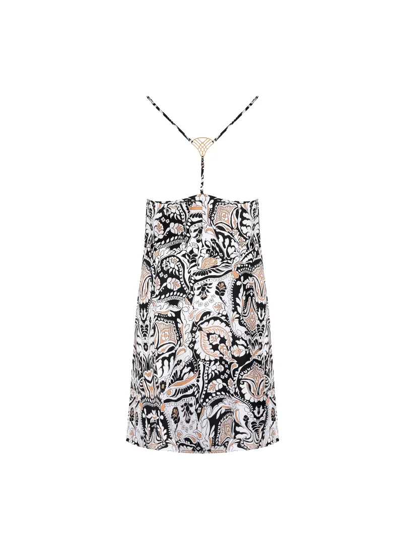 Confectionnée dans un tissu luxueux, doux et fluide au toucher, cette robe sublime la silhouette avec grâce et raffinement. Sa taille cintrée flatte les courbes naturelles tout en assurant un confort optimal. De fines bretelles ajustables offrent un maintien discret et un ajustement personnalisé. Conçue pour une discrétion élégante par-dessus le maillot de bain, elle se superpose harmonieusement tout en conservant une silhouette épurée. L’imprimé Reve Eclat apporte une touche artistique vibrante et une sophistication contemporaine à votre garde-robe de vacances. Légère et polyvalente, elle se porte aussi bien à la plage qu’en terrasse le soir venu. Idéale pour des escapades romantiques en bord de mer et des soirées élégantes.
