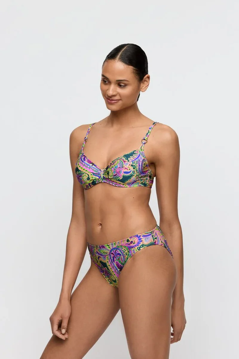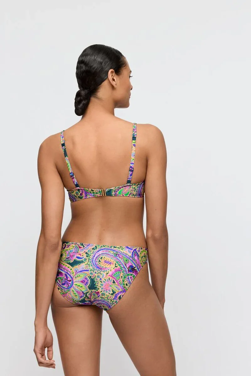 Culotte de bikini Rio aux couleurs vibrantes, à motif cachemire tropical, offrant une silhouette flatteuse et une énergie estivale audacieuse.