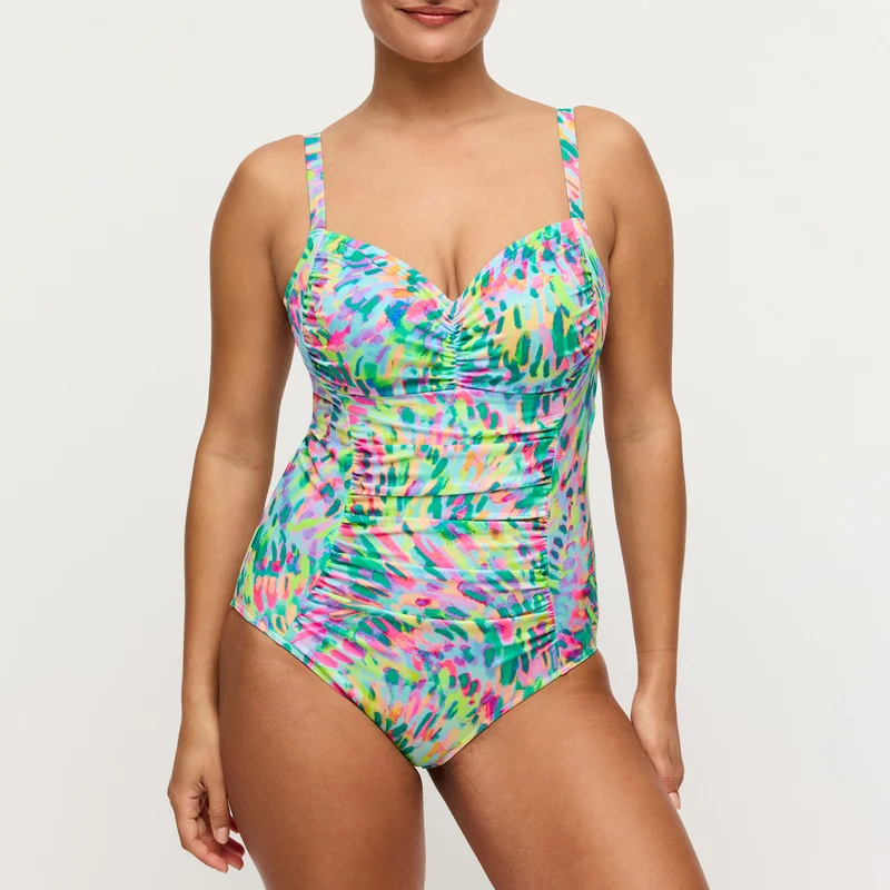 Un maillot de bain sculptant à bonnets emboîtants offrant un maintien optimal et un style estival impressionniste éclatant.