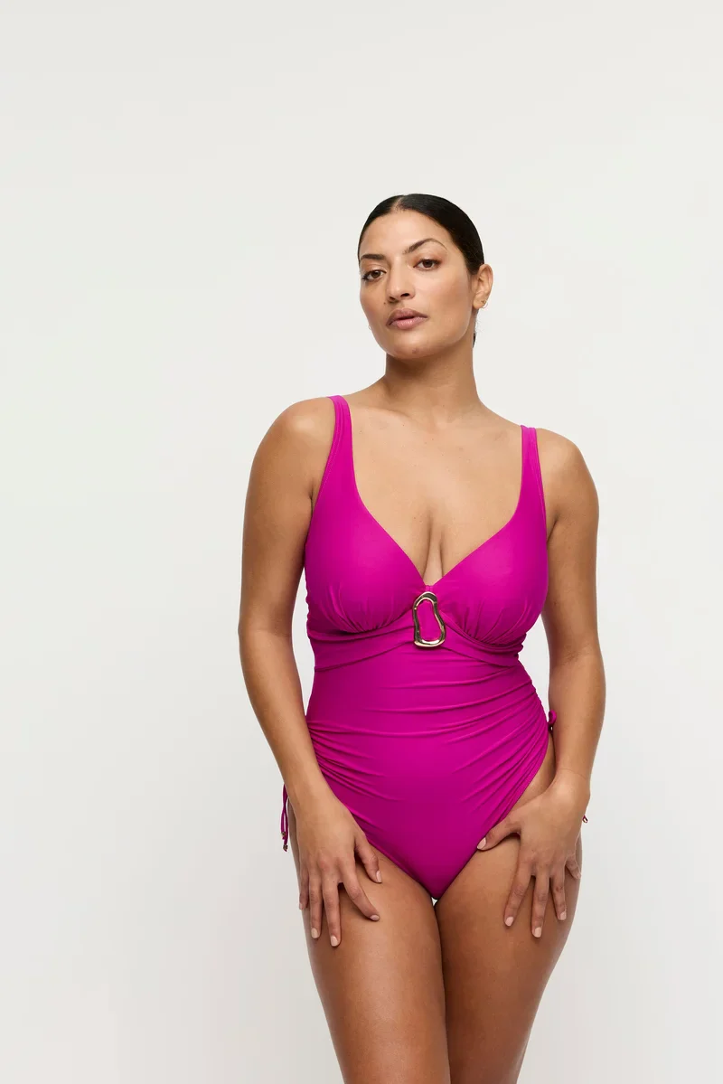 Un maillot de bain sculptant à décolleté plongeant, conçu pour sublimer la silhouette, dans un riche coloris magenta profond.