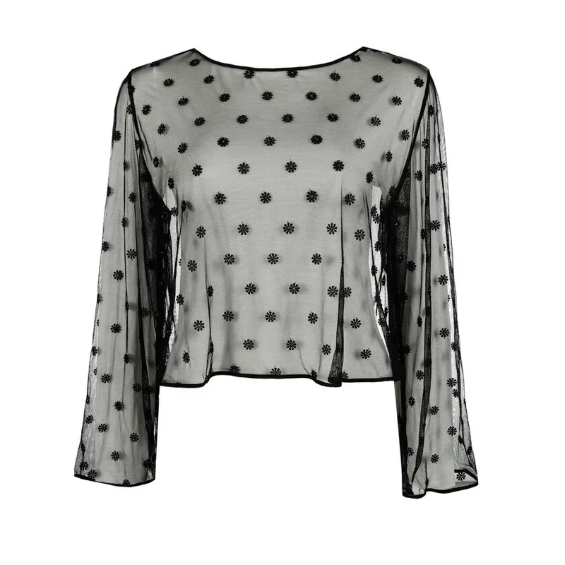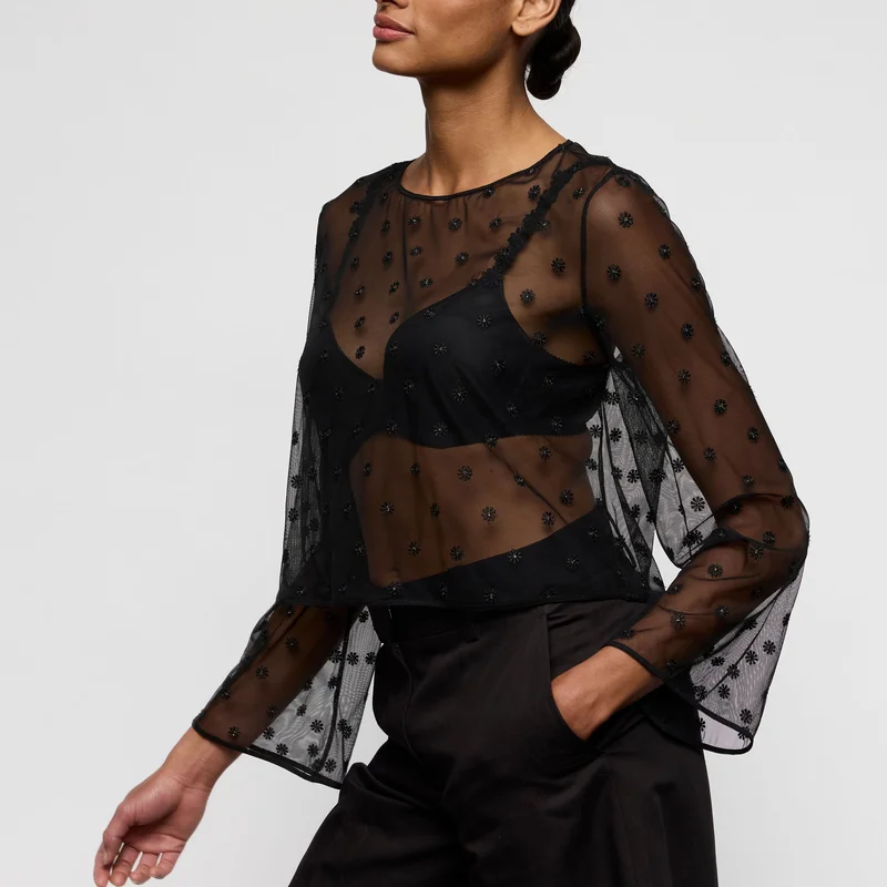 Un top délicat sans bonnets, de couleur noire, offrant une élégance légère et un raffinement contemporain en dentelle.