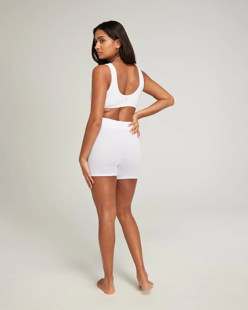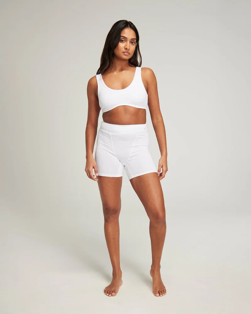Un boxer boyfriend en coton biologique respirant blanc, conçu pour un confort décontracté et une simplicité intemporelle.