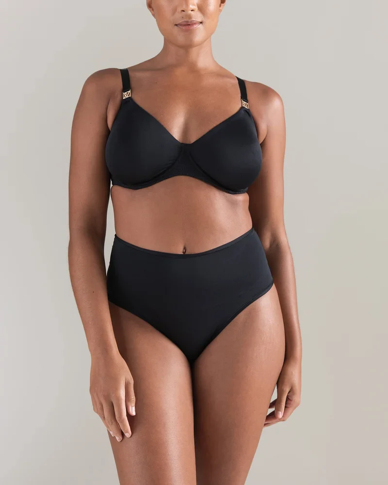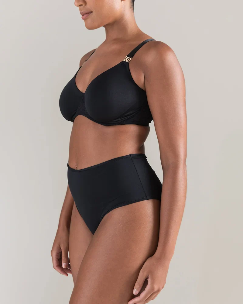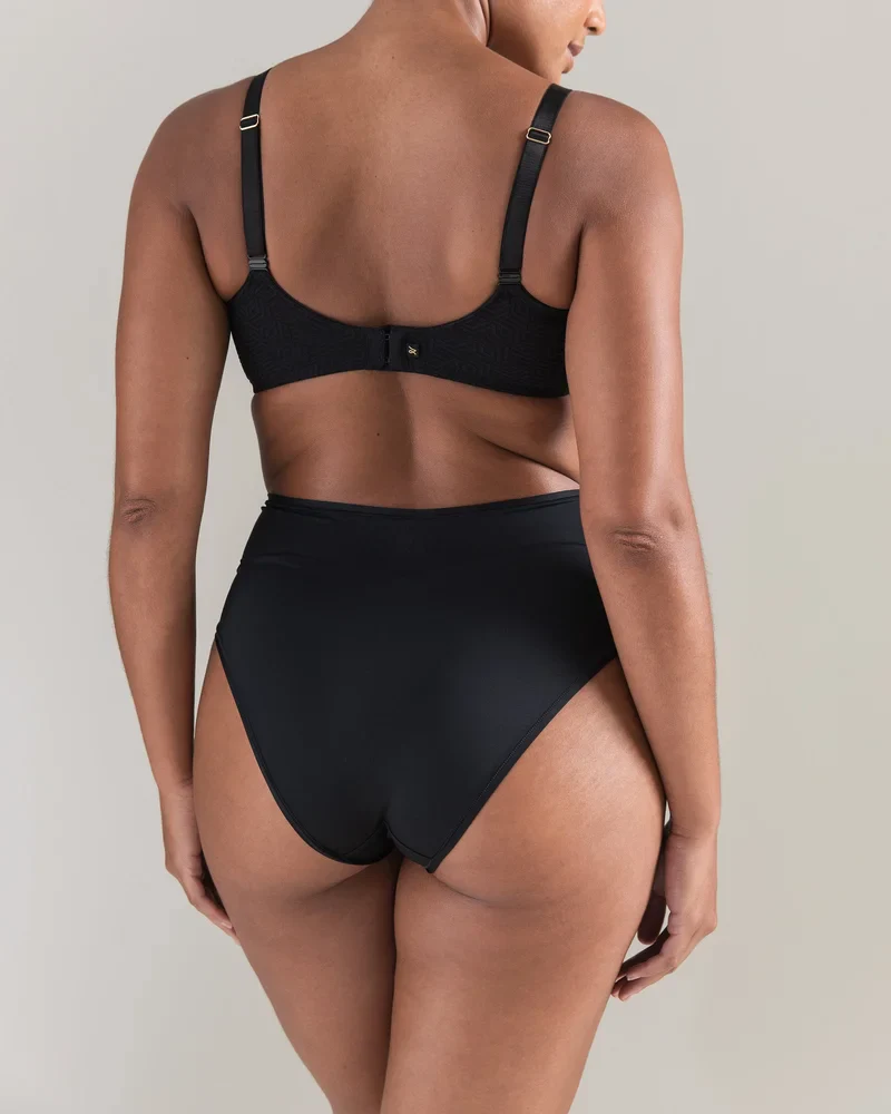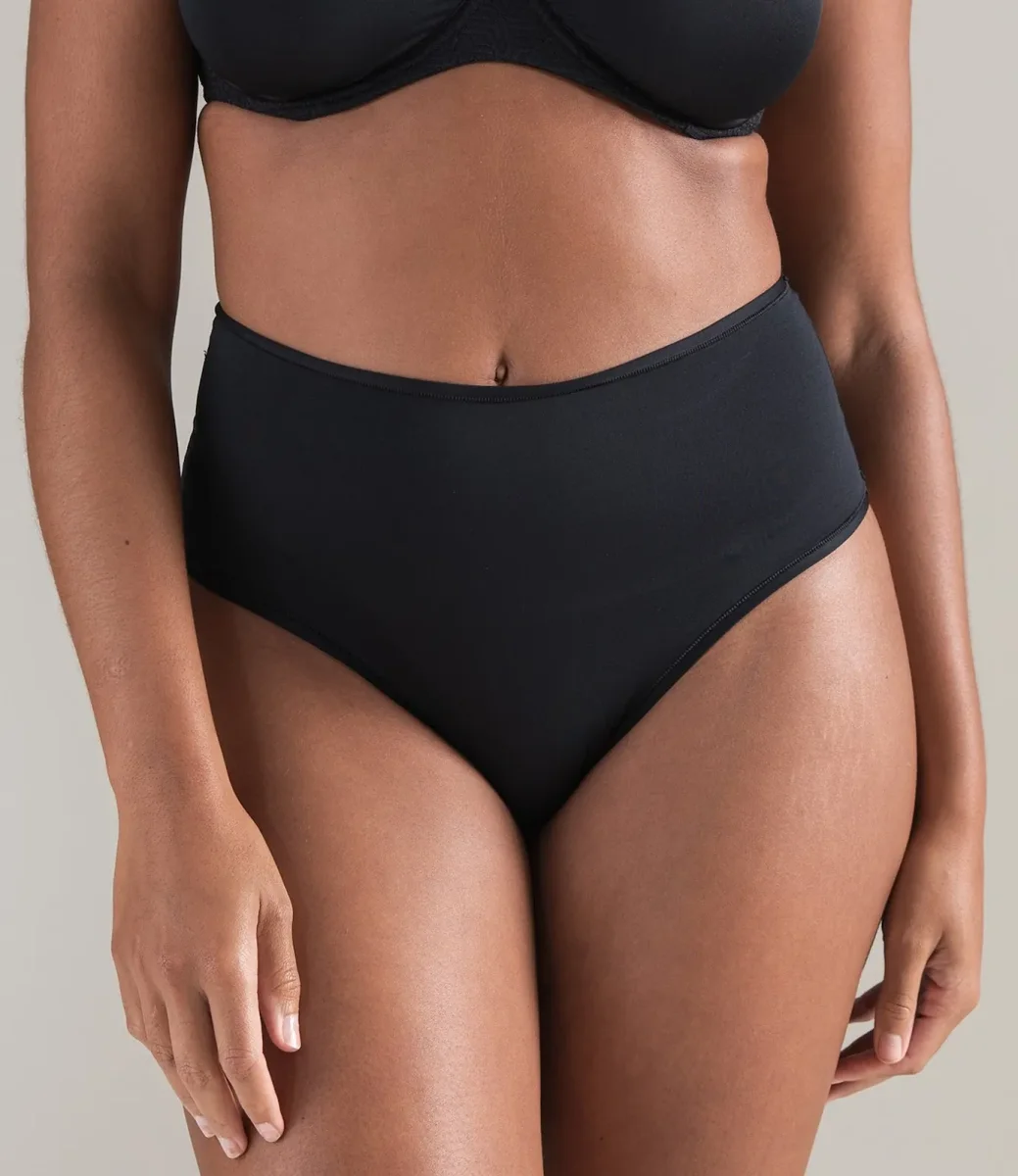 Une culotte seconde peau taille haute noire, conçue pour sculpter la silhouette et offrir un confort quotidien optimal.
