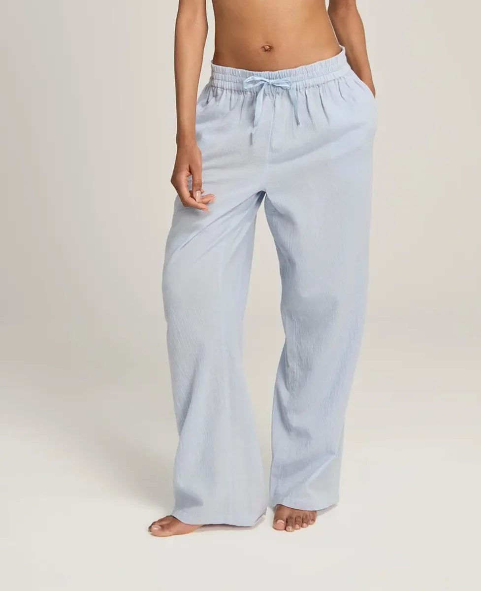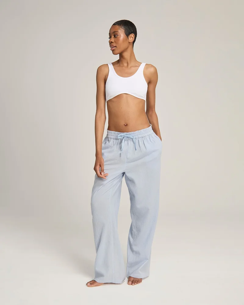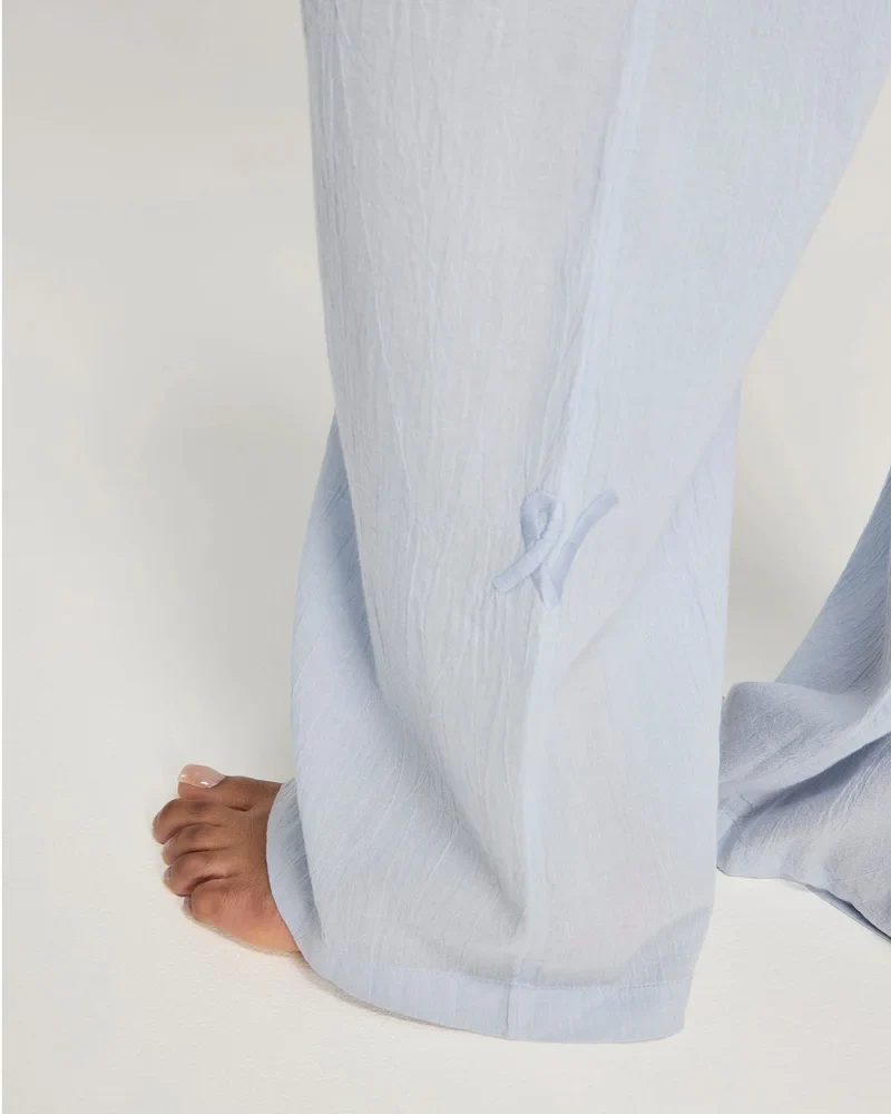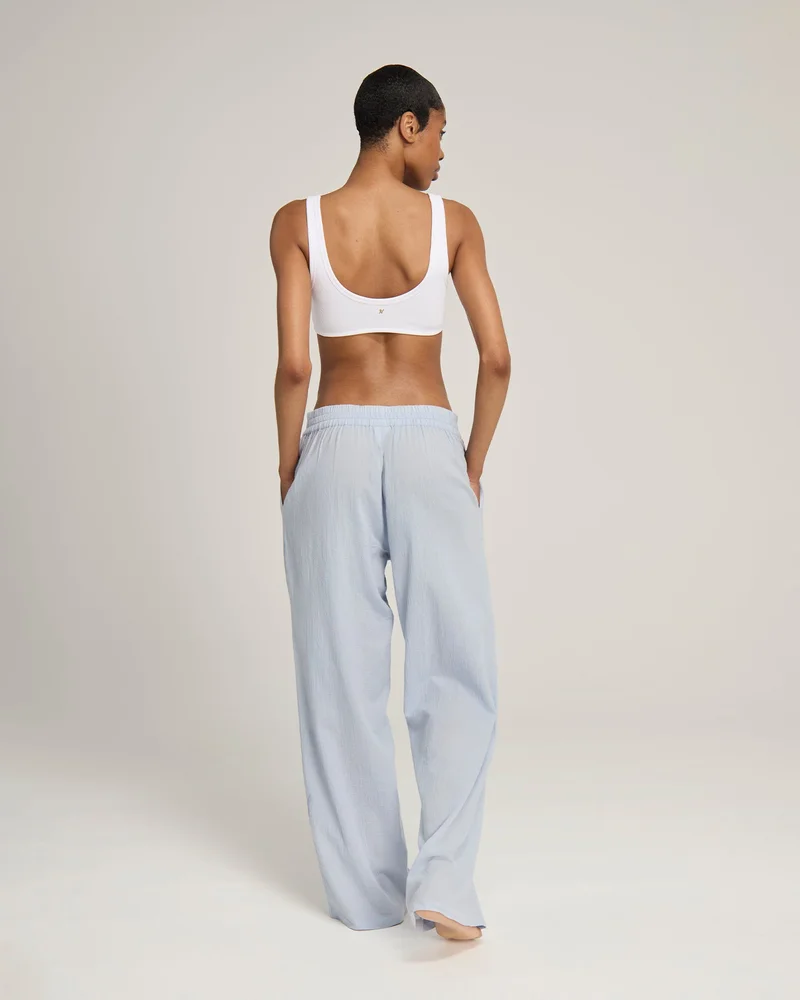 Un pantalon léger en gaze de coton couleur ciel, conçu pour un confort respirant et une sophistication sans effort.