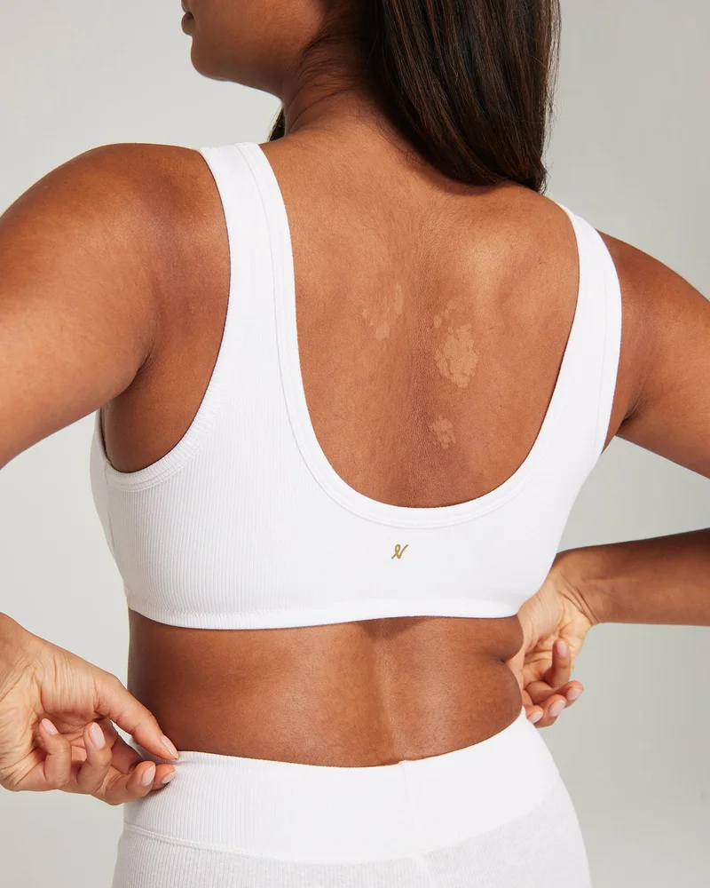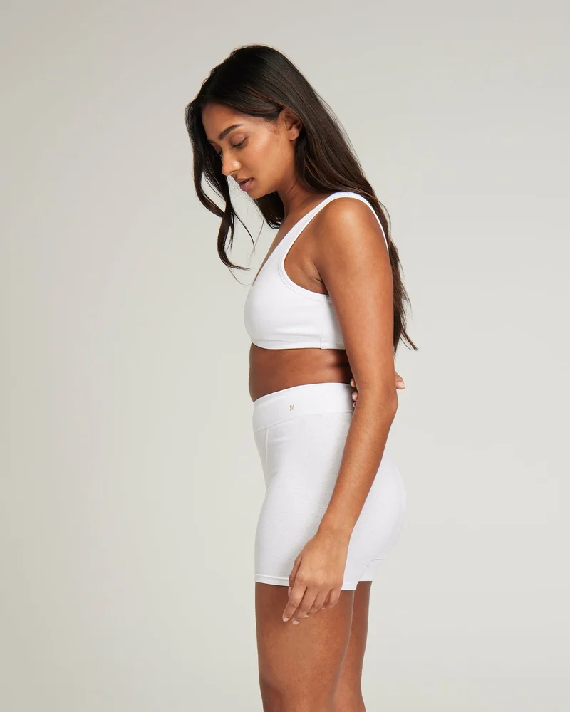 Une brassière blanche en coton biologique respirant à décolleté plongeant, conçue pour un galbe doux et un confort au quotidien.