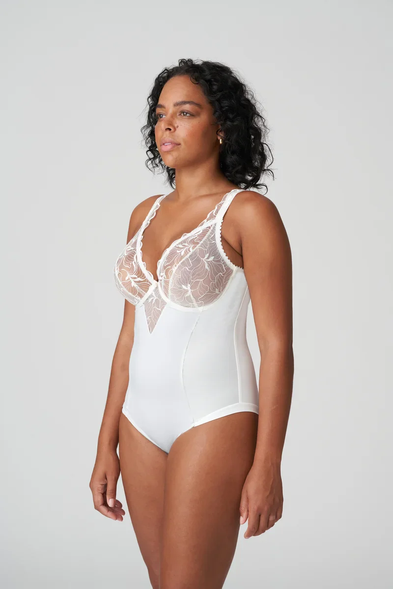 Un body lingerie sculptant qui mélange tulle brodé et tissu lisse, offrant une forme élégante et une silhouette naturellement liftée.