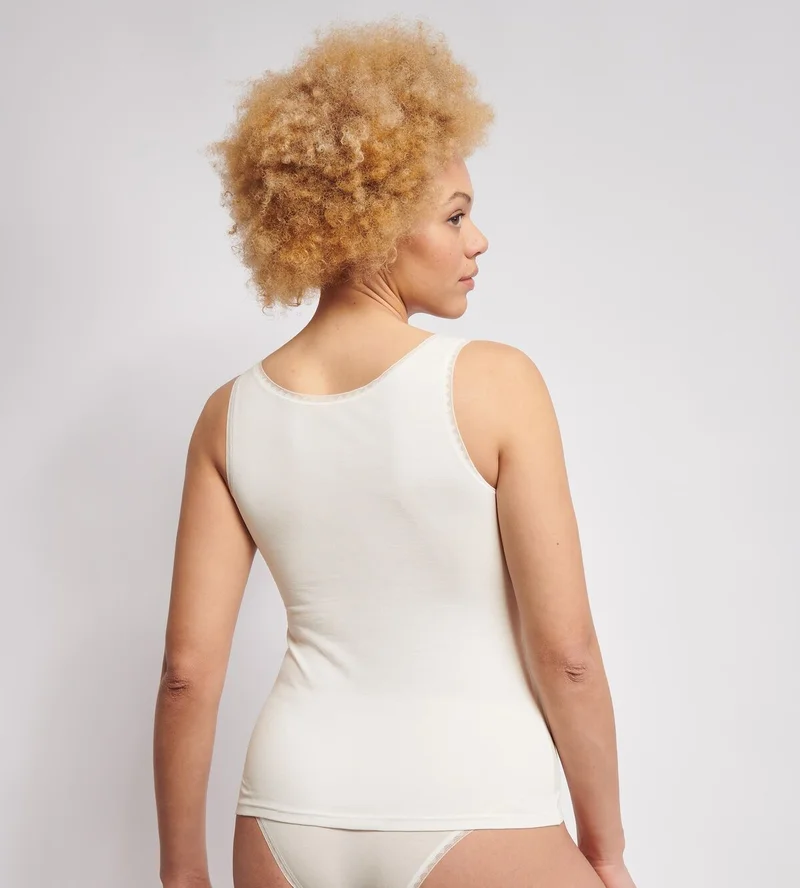 Un débardeur côtelé doux couleur blanc soie offrant une élasticité naturelle, un confort respirant et une grande facilité d’utilisation au quotidien.