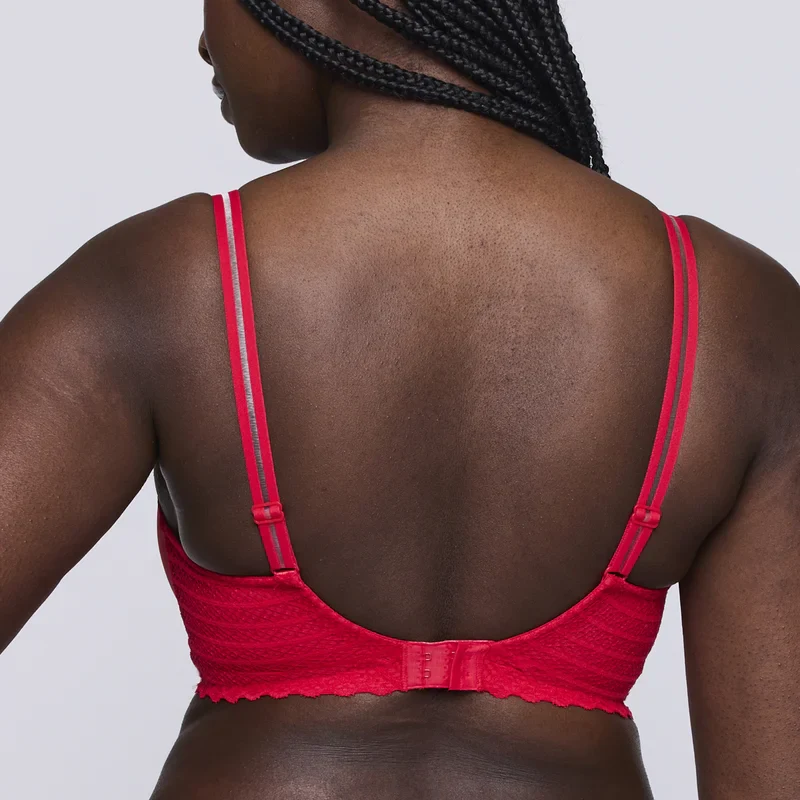 Un soutien-gorge emboîtant audacieux d’un rouge éclatant, alliant des bonnets galbants et une dentelle raffinée pour un confort optimal au quotidien.