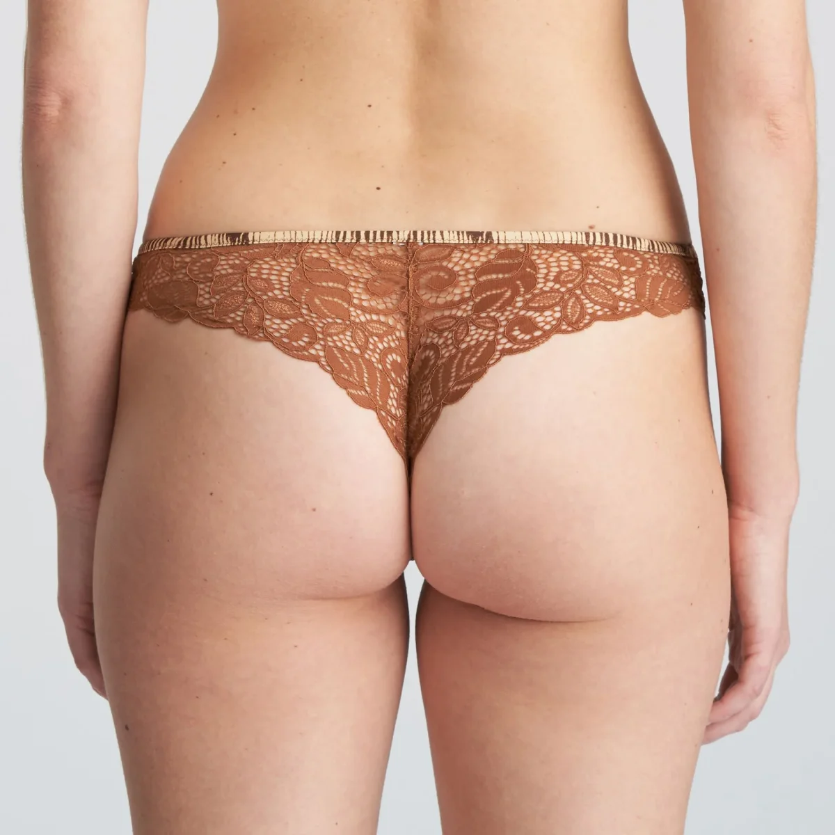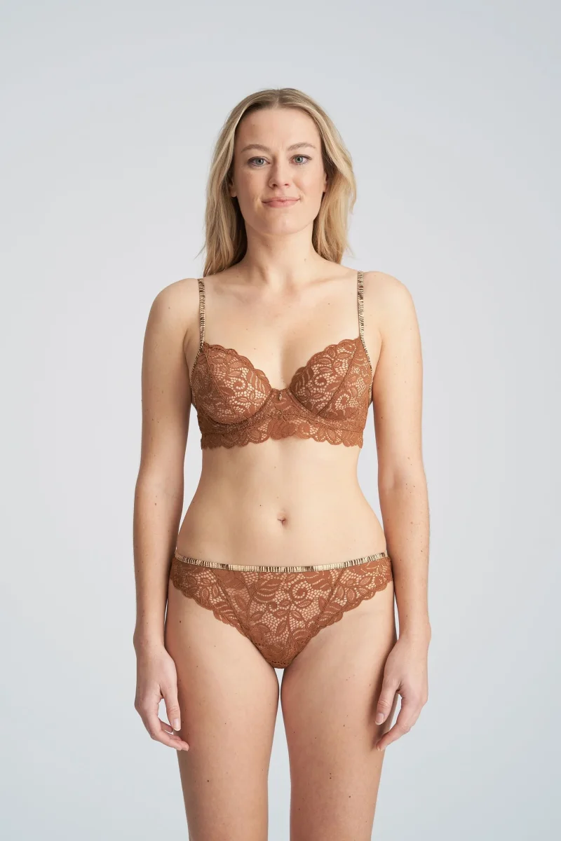 La collection Amalie de Marie Jo est une magnifique ménagerie de dentelle et de ruban, déclinée dans un bronze terreux profond, elle ne manquera pas d’invoquer le désir primordial.